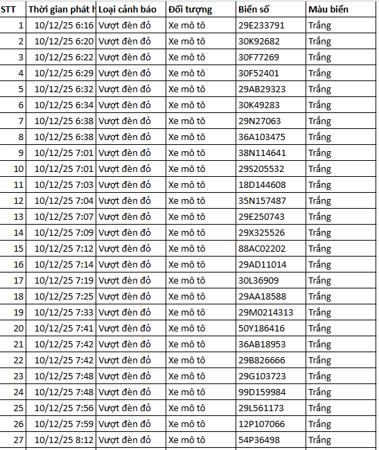 Theo Cục Cảnh sát giao thông, từ 12h00’ ngày 9/12/2025 đến 12h00’ ngày 10/12/2025, qua trích xuất dữ liệu từ camera A.I được thí điểm lắp đặt tại nội đô Hà Nội (nút giao phố Phạm Văn Bạch - Hoàng Quán Chi), đã tự động phát hiện 129 trường hợp xe mô tô (xe máy) vi phạm.