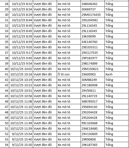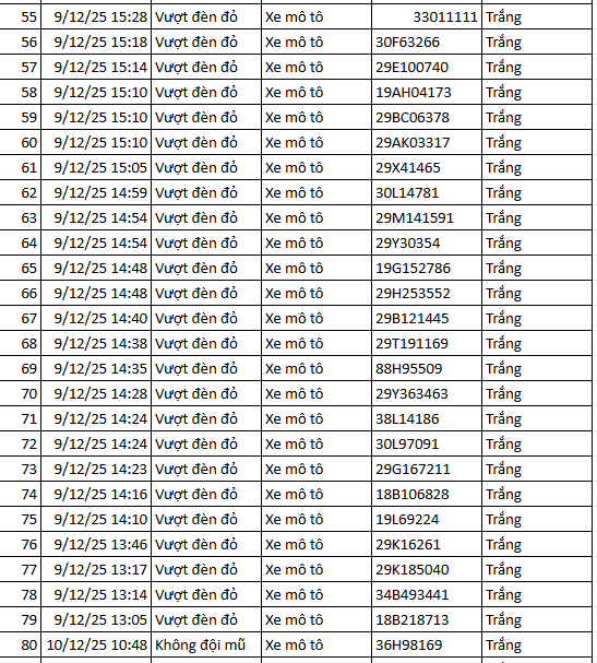Ngày 1/12, Phòng CSGT Công an tỉnh Thanh Hóa thông báo các phương tiện vi phạm về TTATGT đường bộ được phát hiện qua Hệ thống camera giám sát an ninh, trật tự và an toàn giao thông trên địa bàn từ ngày 20/10/2025 đến ngày 31/10/2025. Theo danh sách, có 52 trường hợp xe máy vi phạm.
