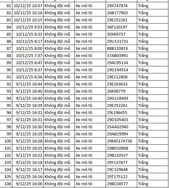 Danh sách 176 trường hợp xe máy vi phạm như sau: