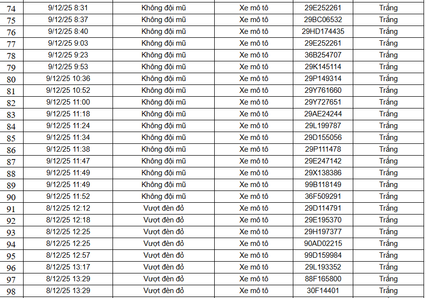 Danh sách cụ thể 78 trường hợp xe máy vi phạm như sau:
