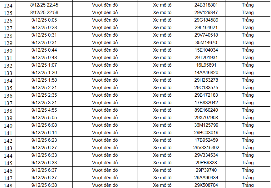 Danh sách 148 trường hợp xe máy vi phạm như sau: