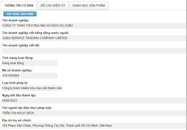 Theo Cổng thông tin Quốc gia về doanh nghiệp, Công ty TNHH Thương mại dịch vụ ZuBu thành lập ngày 5/5/2021. Địa chỉ trụ sở chính tại 154 Phạm Văn Chiêu (phường Thông Tây Hội, TP. HCM), người đại diện theo pháp luật kiêm Giám đốc hiện tại là cá nhân Trần Thị Ngọc Bích (sinh năm 1986).