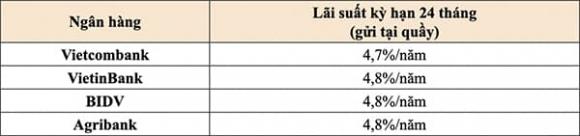 Cụ thể, VietinBank niêm yết lãi suất 4,8%/năm cho khoản tiền gửi kỳ hạn 24 tháng. BIDV và Agribank cũng áp dụng mức tương tự. Vietcombank là ngân hàng có mức thấp hơn, ở 4,7%/năm, tức giảm 0,1 điểm phần trăm so với ba ngân hàng còn lại.