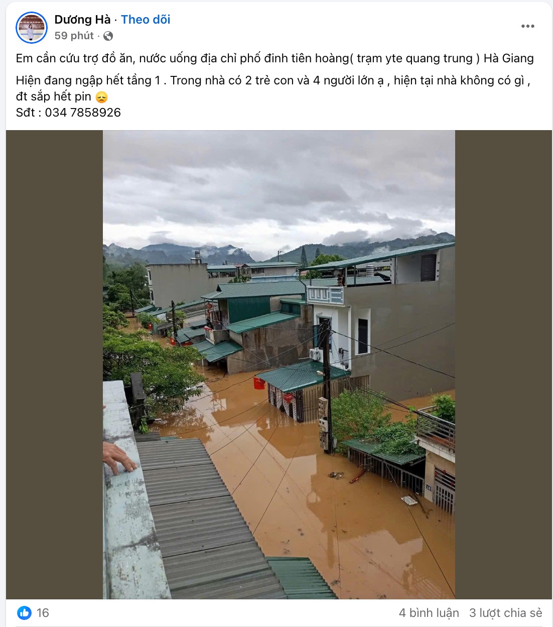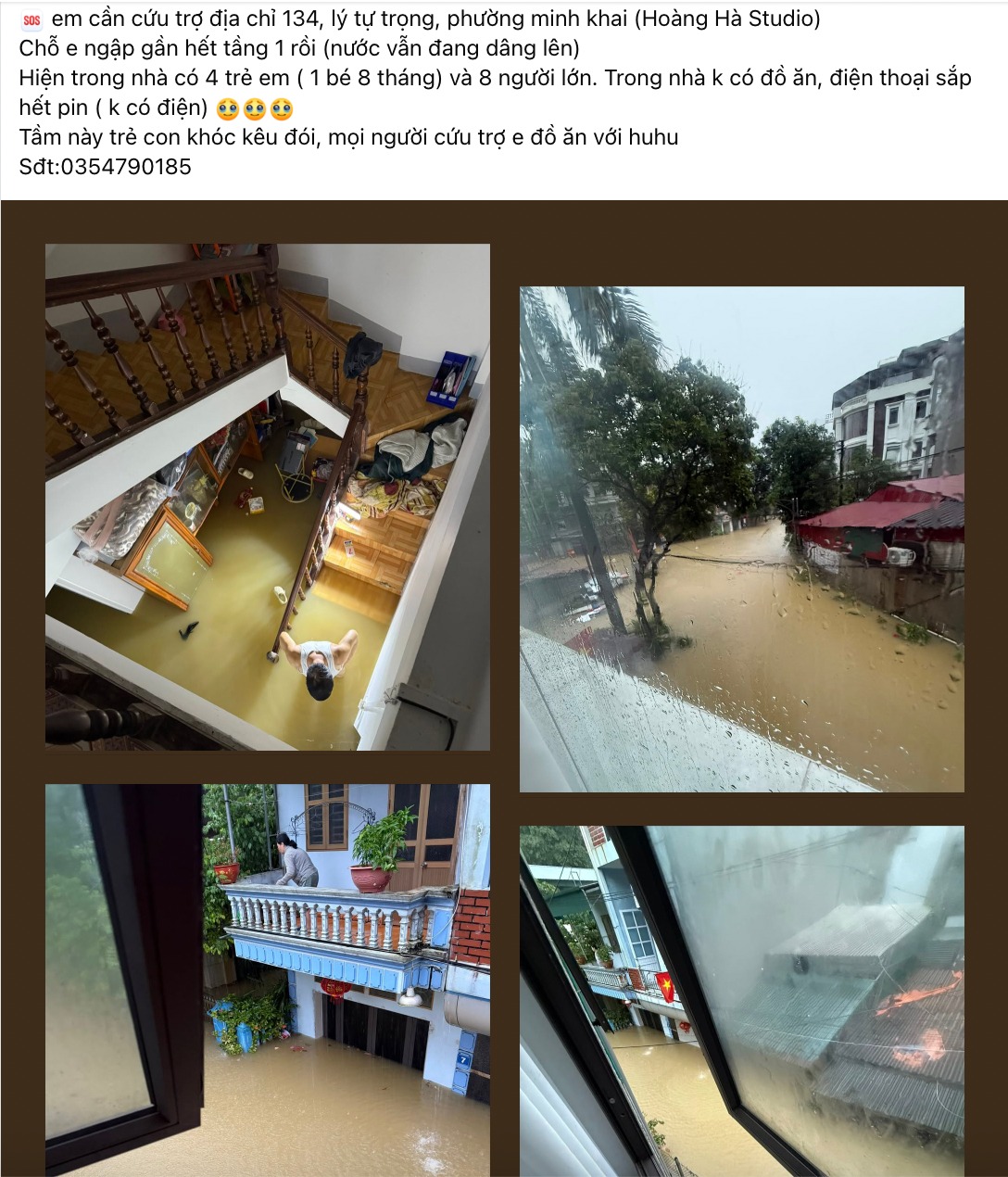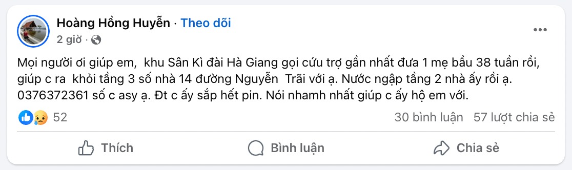 Nước lũ dâng cao khiến nhiều người không kịp trở tay. Lo lắng, hoảng sợ khi nước dâng cao, trong nhà lại có người già, trẻ nhỏ, phụ nữ mang thai.... người dân đành gửi lời cầu cứu lên facebook kèm theo số điện thoại liên lạc để hy vọng thông tin đến được với các lực lượng cứu hộ.