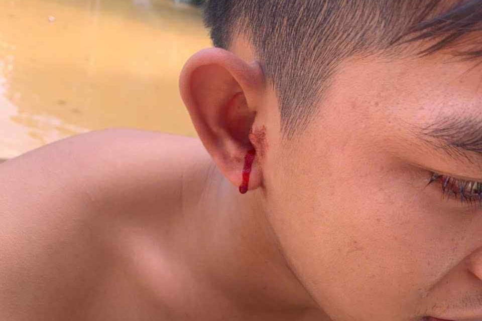 Khoảng trưa cùng ngày, khi bơi quanh khu vực để nhặt lại đồ bị nước cuốn, Sinh bất ngờ cảm thấy có vật gì đó chui vào tai. Ban đầu, anh chỉ thấy khó chịu. Một lúc sau, mỗi khi cử động mạnh, con vật cắn khiến chàng trai đau buốt và ch:ảy m:áu.