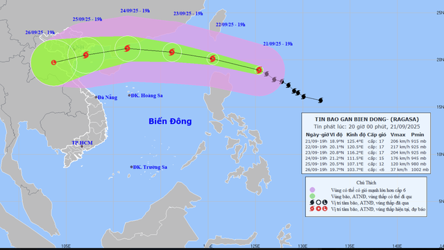 Khi vào Biển Đông, siêu bão Ragasa tiếp tục di chuyển nhanh khoảng 20km/h và duy trì cường độ cực đại cấp 17, giật trên cấp 17 trong ngày 22–23/9, tương đương hoặc vượt cường độ mạnh nhất của bão số 3 (Yagi) năm 2024.