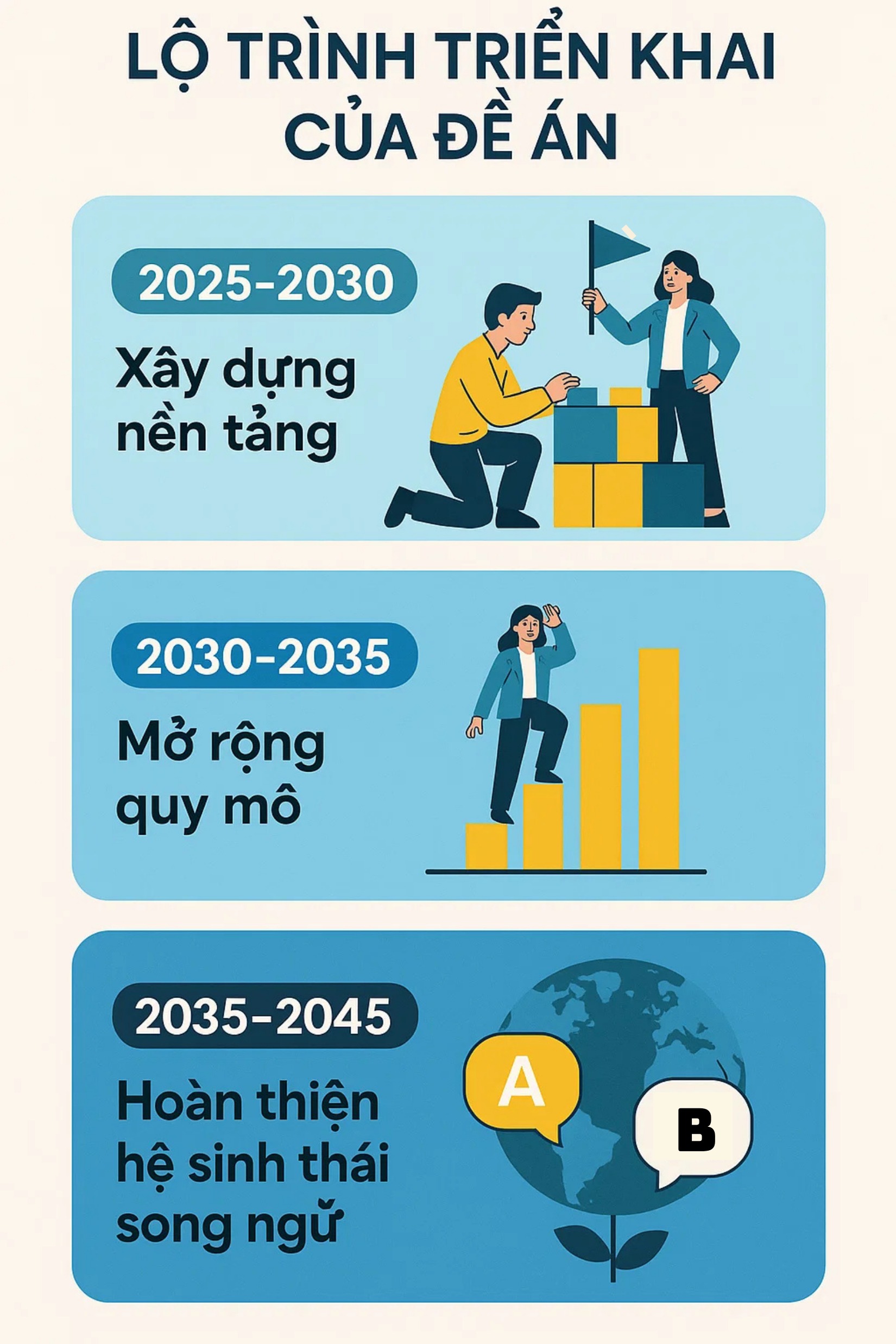 Giai đoạn 2035 – 2045: Hoàn thiện hệ sinh thái song ngữ, tiếng Anh được sử dụng một cách tự nhiên trong dạy học, giao tiếp và quản trị nhà trường.